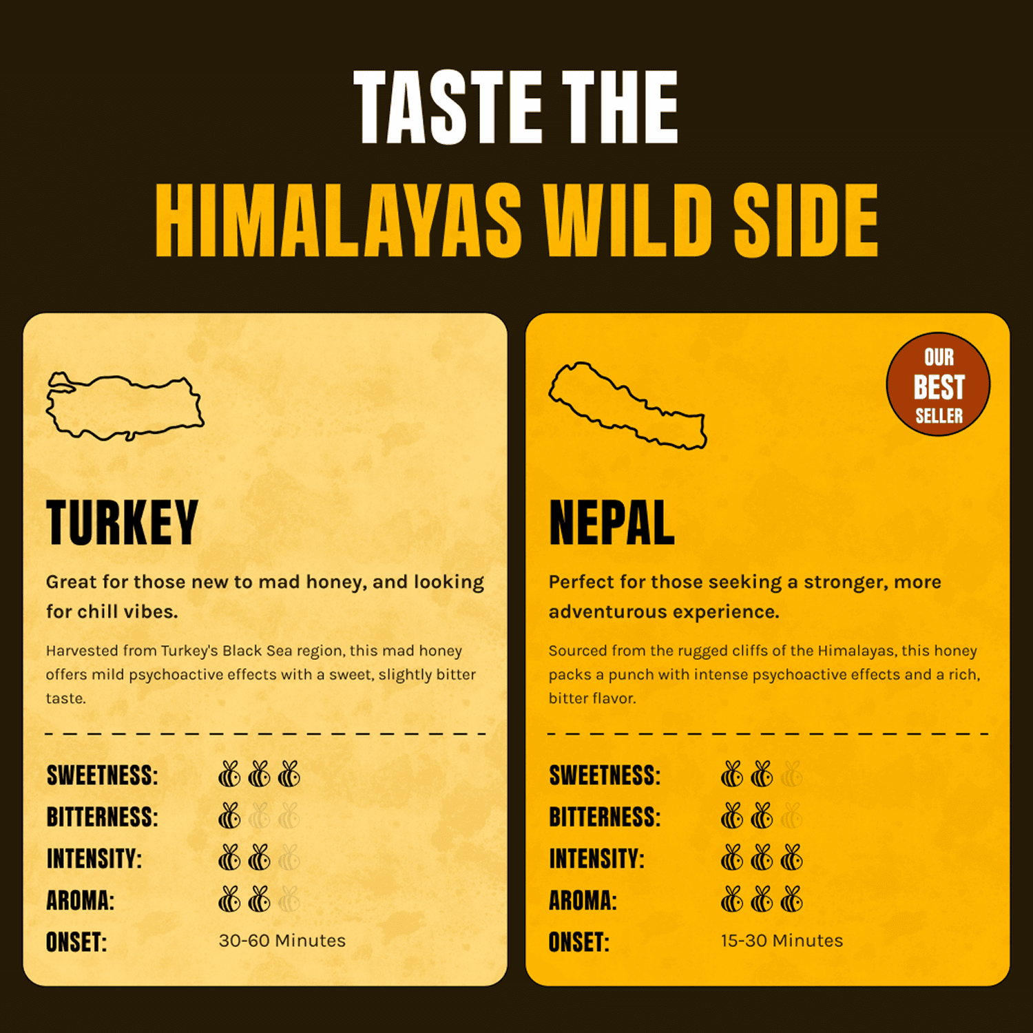 With Real Mad Honey, you get more variety than the other brands. Think of this as walking into an Amsterdam coffee shop. You’re spoiled for choice. We’re the only company that sells both Turkish and Nepalese mad honey.