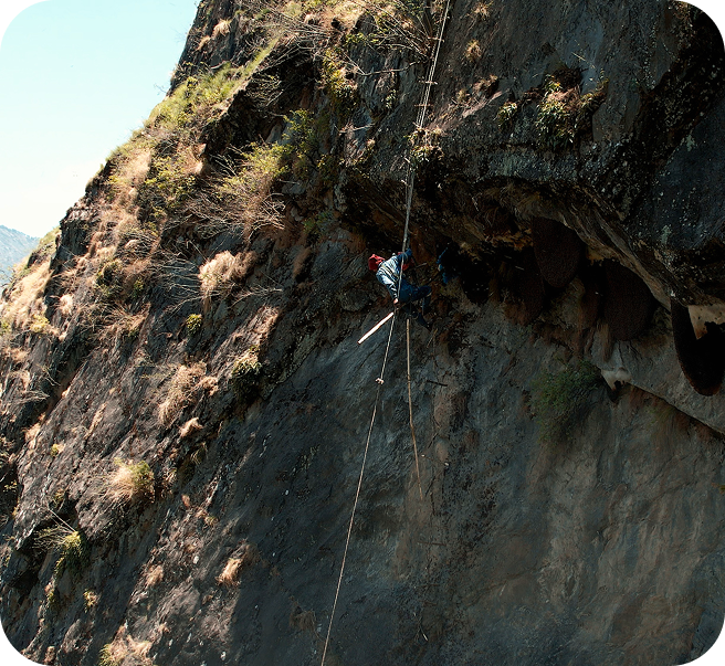 When they reach the cliffs, they build rope ladder systems on-site. Then, they descend - often 100, 150, even 200 feet above the ground - while smoke from burning green rhododendron branches swirls around them, agitating tens of thousands of defensive bees. They work quickly, using long bamboo poles with curved knives to cut sections of honeycomb - each section can weigh 50 pounds or more. They lower these sections down in baskets, then climb back up, often stung dozens of times in the process.
